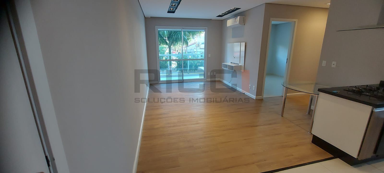Sala de TV com armários planejados e ar-condicionado, climatizando toda a área social
