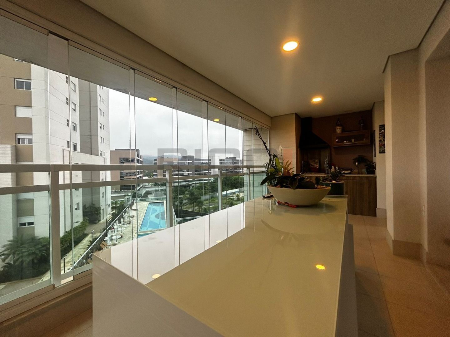 Varanda gourmet espaçosa, com vista para a cidade e para a piscina, ideal para receber amigos e familiares