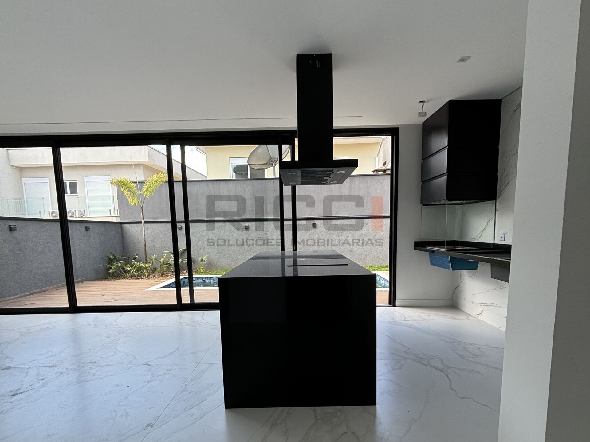 Cozinha moderna, equipada com cooktop, coifa e acabamento em pedras naturais