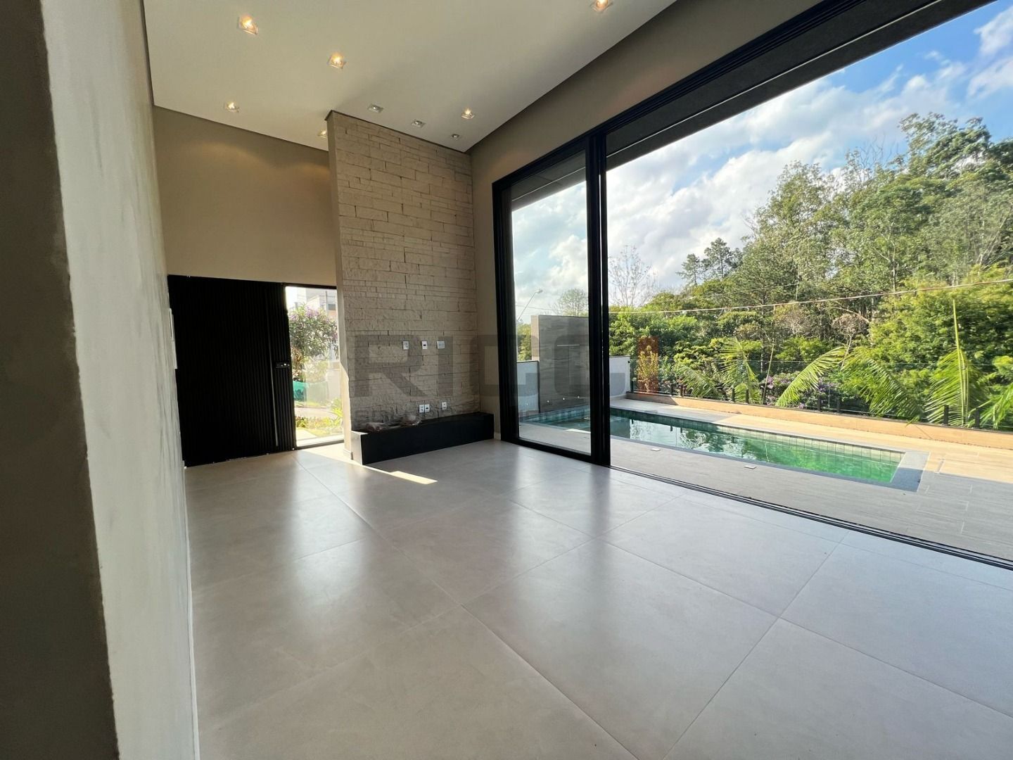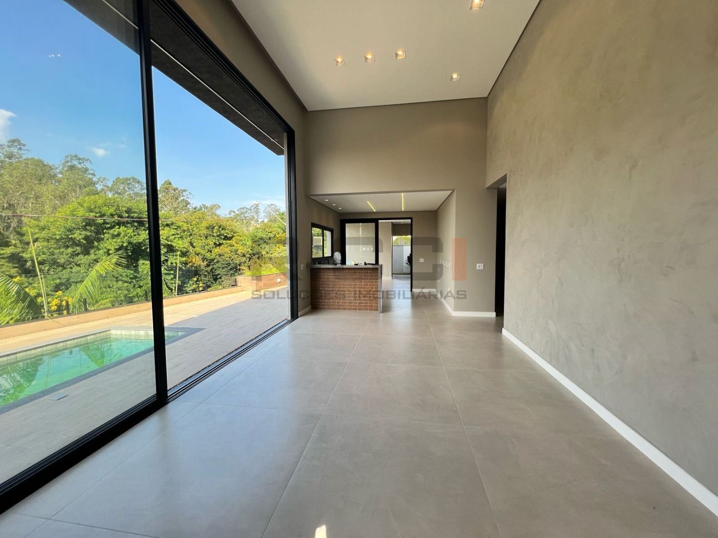 Sala com pé-direito duplo, proporcionando amplitude e iluminação natural