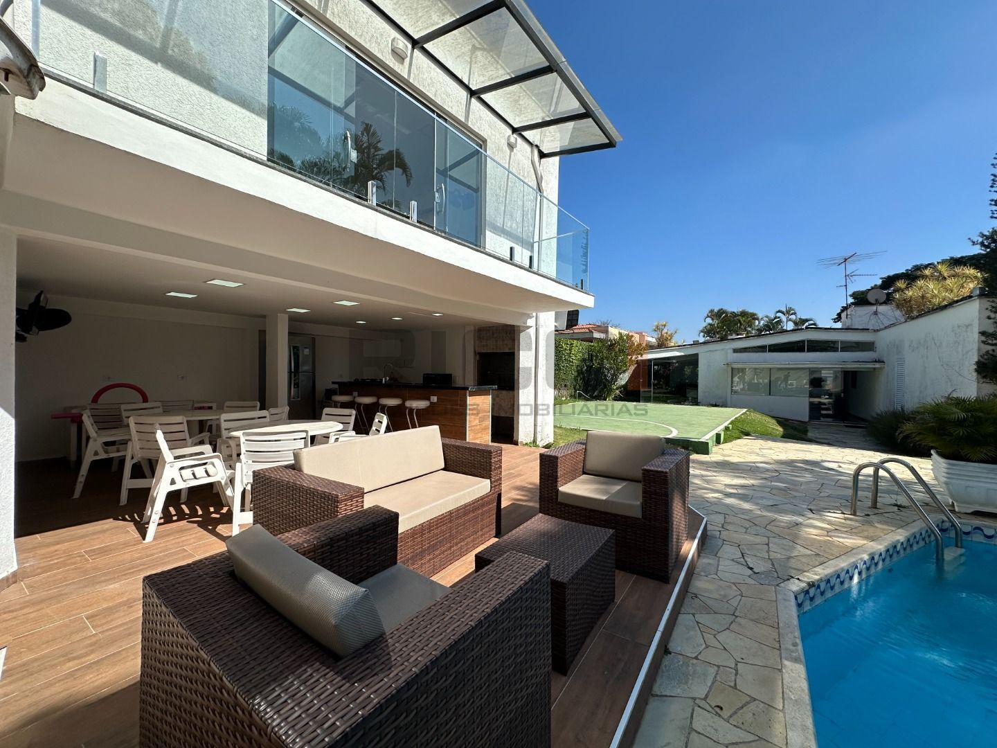 O lazer é um dos pontos altos do imóvel. A área externa foi cuidadosamente projetada para momentos de descontração e confraternização. A área gourmet é completa, com churrasqueira, bancada em granito e um amplo espaço para receber convidados. A piscina convida para os dias de sol, cercada por um paisagismo bem cuidado que valoriza ainda mais a estética do imóvel. Além disso, a casa conta com uma academia particular e uma quadra esportiva, proporcionando bem-estar e atividades físicas sem sair de casa.