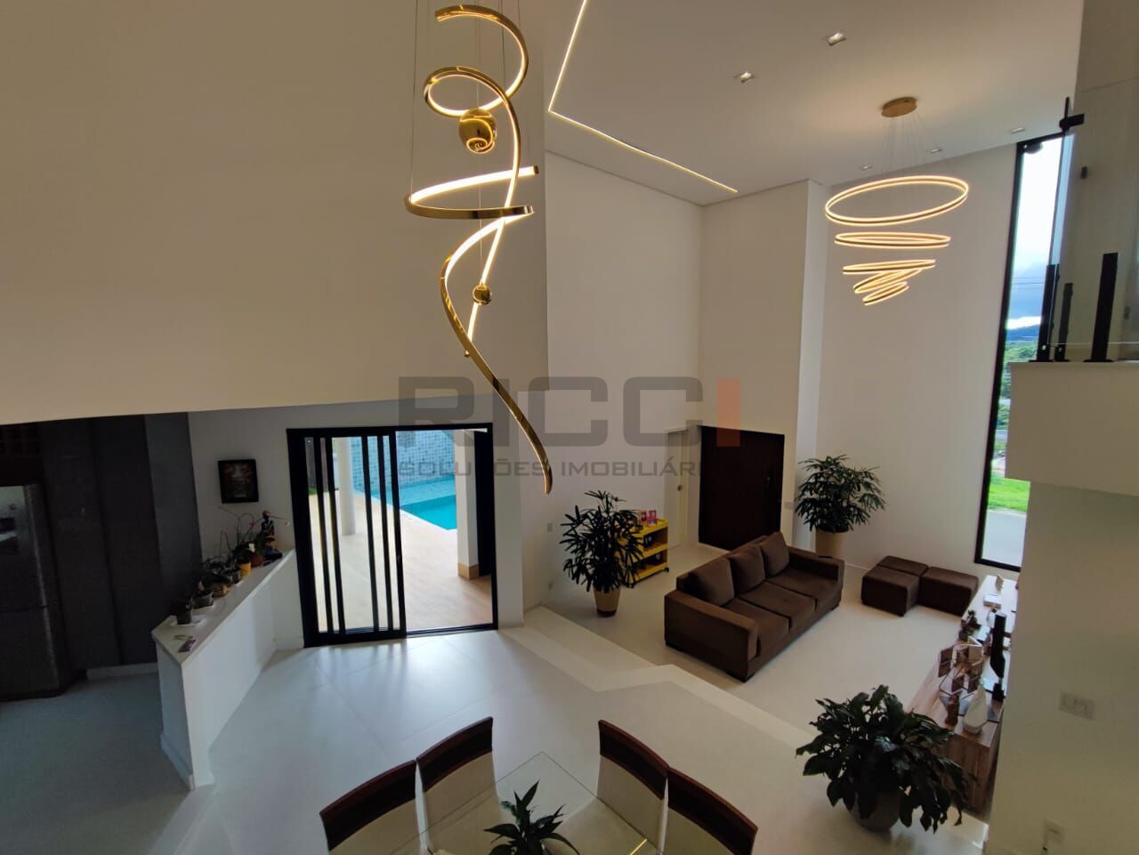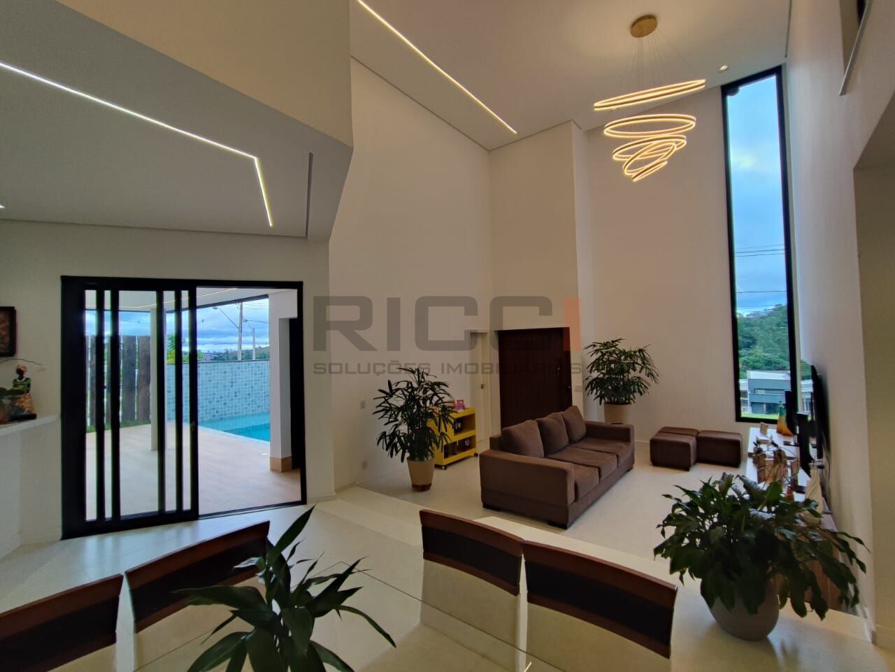 Sala ampla com pé-direito duplo, que proporciona sofisticação, ventilação natural e luminosidade